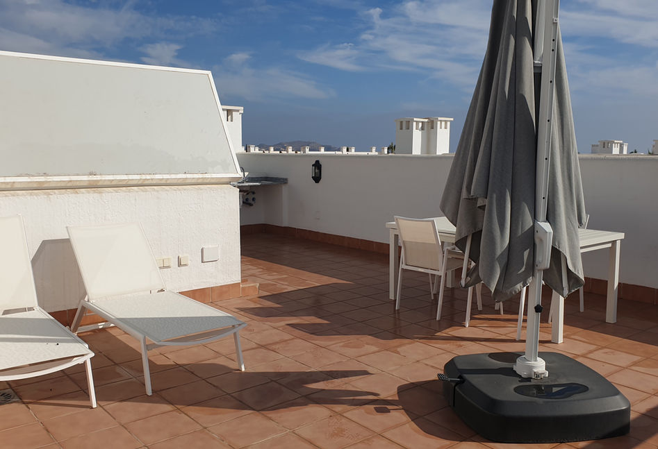 Solarium privada, 2 tumbonas, mesa, 4 sillas y sombrilla